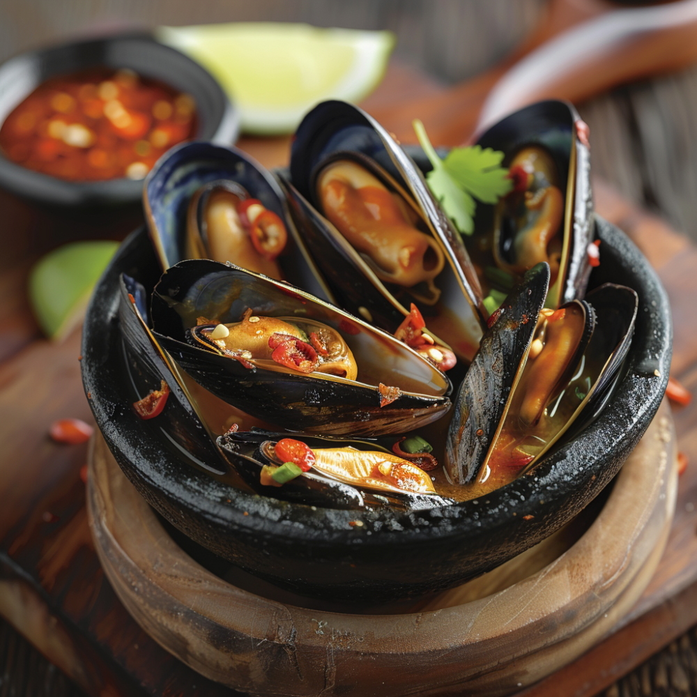 Мидии в остром и кислом соусе том ям с кокосовым молоком.