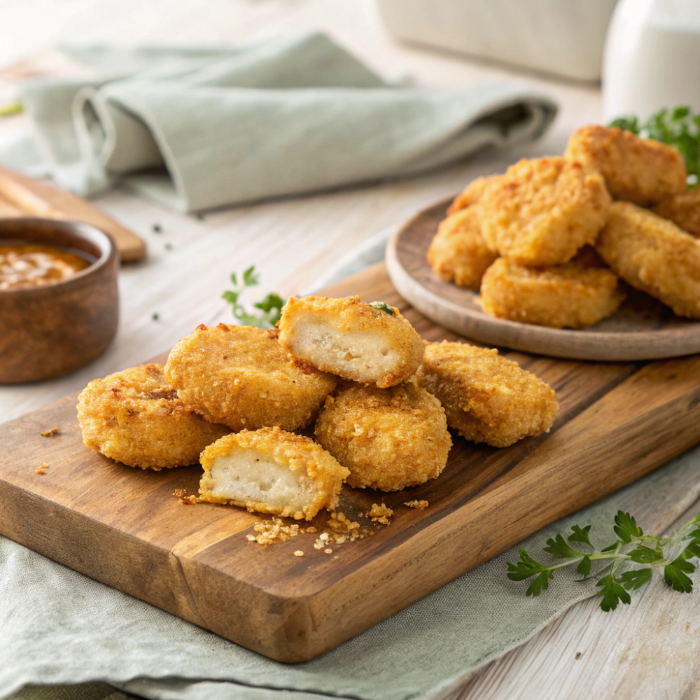 Кусочки куриного филе в сухарях, обжаренные во фритюре. Изображение блюда создано с помощью искусственного интеллекта и может не точно соответствовать реальному внешнему виду, но состав и ингредиенты всегда соответствуют описанию.